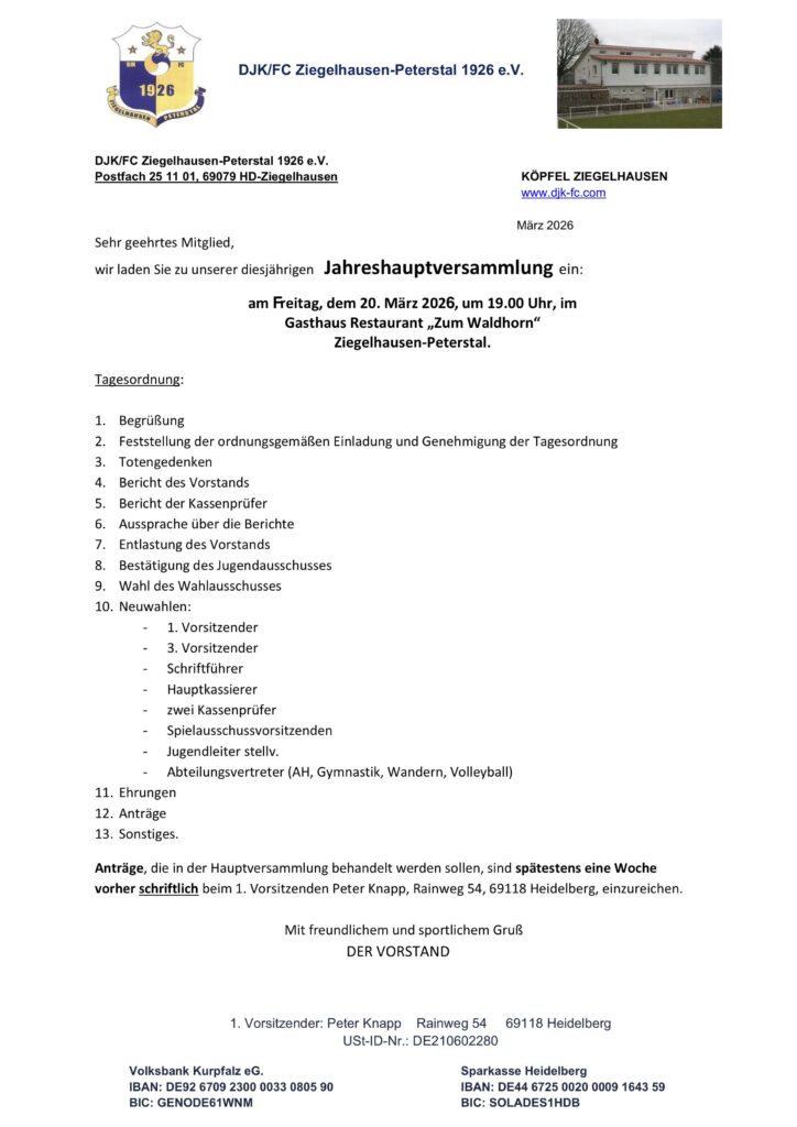 Die jährliche Jahreshauptversammlung der DJK/FC Ziegelhausen 1926 e.V. findet am